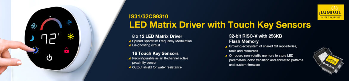 In addition to the RISC architecture, the IS31CS9310 and IS32CS9310 feature 256KB of integrated non-volatile memory to store not only custom LED patterns but also custom firmware for HMI white goods home appliances, automotive dashboard applications, and Industrial control panel use cases. The on-board memory simplifies design and minimizes BOM cost by eliminating the need for external memory and hardware. It also supports more advanced features such as melody generator, OTA (over the air) update capability and debugging port/tool support. “Lumissil is ready to tackle the next challenge integrating LED Drivers and touch sensing microcontrollers, addressing smart homes, appliances, automotive dashboards, industrial automation, and medical equipment with the new IS31CS9310 and IS32CS9310 32-bit MCU SoC,” said Ven Shen, Lumissil’s VP of Marketing. “The IS31CS9310 and IS32CS9310 will aid the development of advanced applications requiring integrated lighting and HMI sensing.”