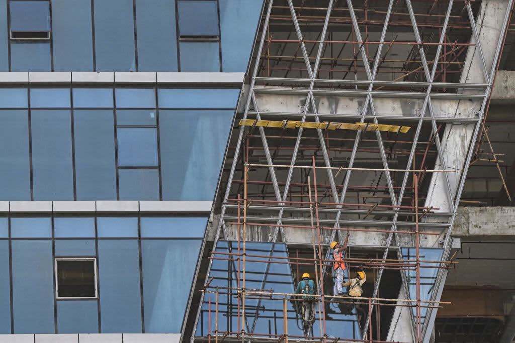 Construction laborers work on a high rise building in Kolkata on July 23, 2024.